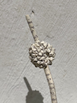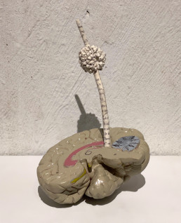 A stroma and perithecia of a cordyceps fungus protrudes from a human brain hemisphere. It is made of paper cut from the book Battle for the American Mind by Pete Hegseth
