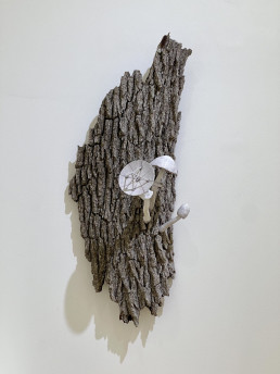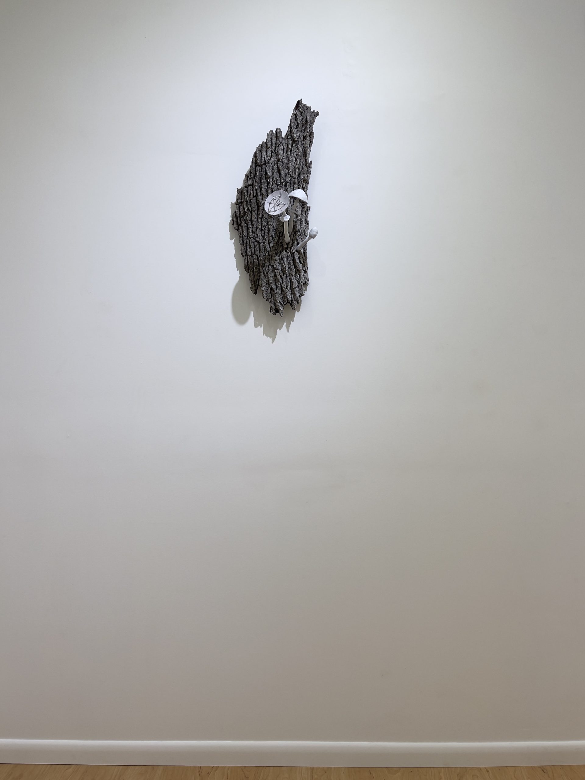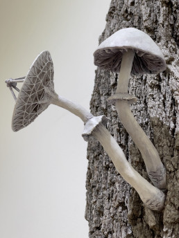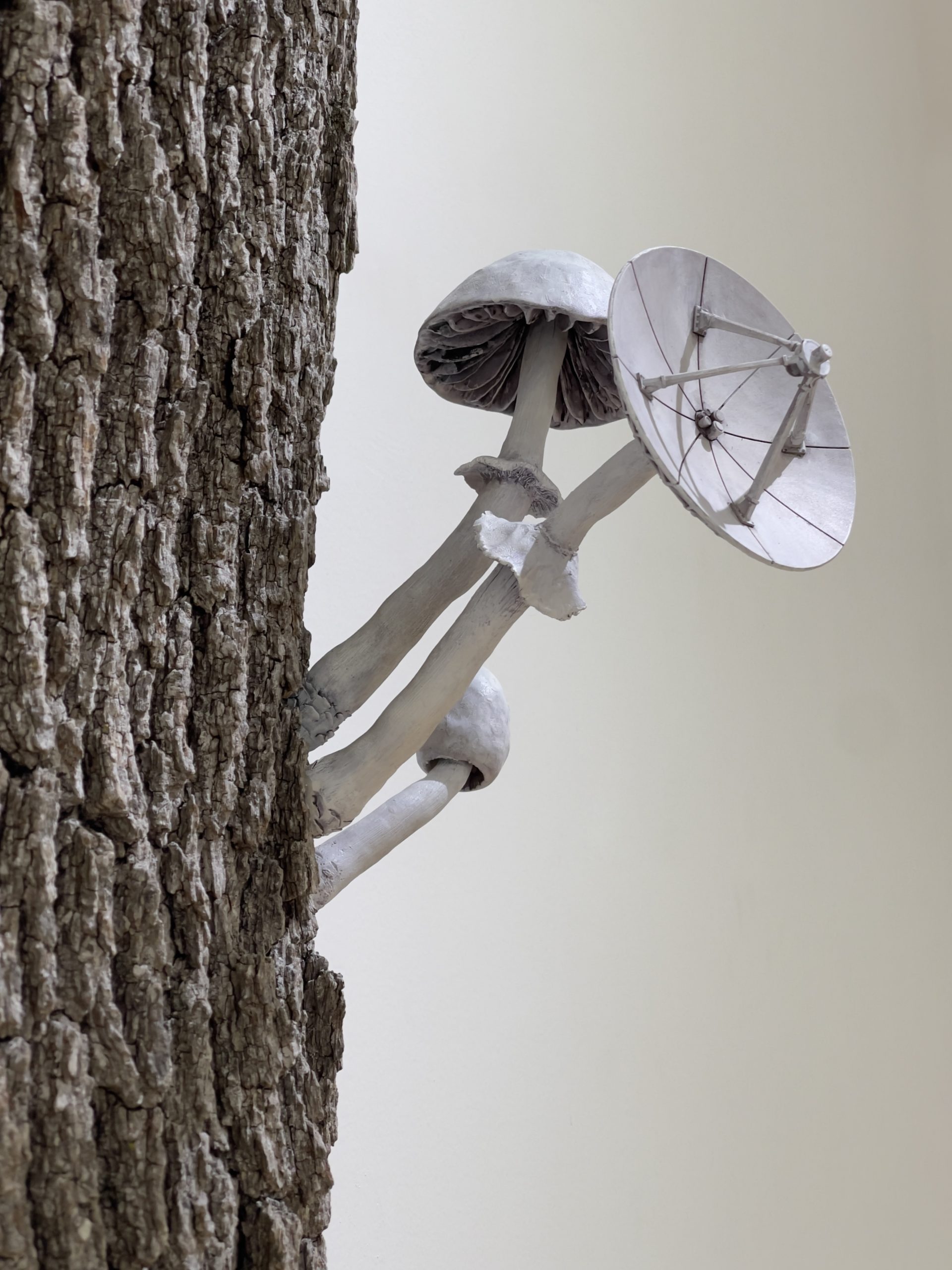 Mushrooms are the fruiting body of mycelium and are therefore an indicator of a complex network hidden beneath the surface. In this case, the mushroom has become a miniature radio telescope antenna connecting the network beneath the surface to one(s) beyond.